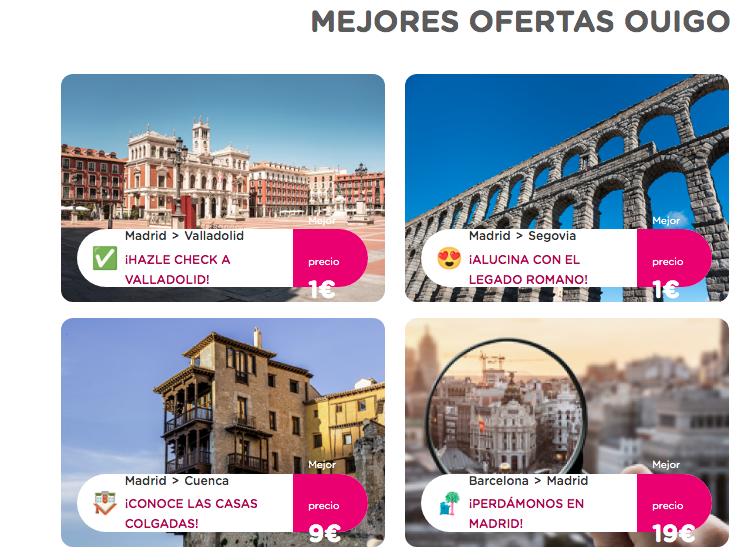 En una potente promoción, Ouigo ofrece también otras alternativas. De este modo, hay billetes de tren por 9 euros, entre Madrid y Cuenca. Además, es posible viajar en tren entre Madrid y Barcelona por 19 euros.