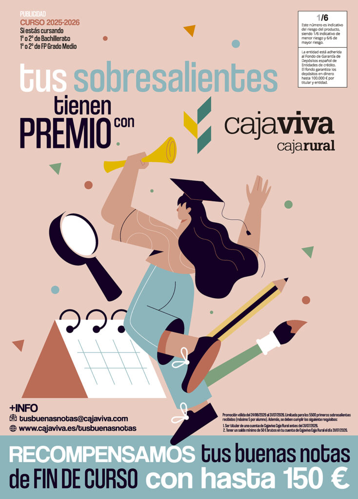 Los buenos resultados académicos tienen hasta 150 euros de recompensa en Segovia. Cajaviva Caja Rural ha puesto en marcha la segunda edición de la campaña “Tus Buenas Notas tienen premio”, una iniciativa con la que busca reconocer el esfuerzo de los estudiantes de primer y segundo curso de Bachillerato y Formación Profesional de Grado Medio durante el curso 2025/2026, premiando los sobresalientes con incentivos económicos, hasta alcanzar el presupuesto total asignado de 165.000 euros.
