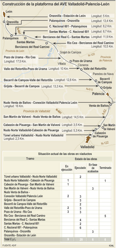 Las obras de construcción de la plataforma sobre la que volará en 2012 el Tren de Alta Velocidad (TAV) entre Valladolid, Palencia y León entran en su última etapa. La traza del nuevo ramal del corredor norte-noroeste dibuja ya una brecha de casi medio centenar de viaductos sobre la geografía castellana y leonesa puesto que alcanza ya un grado de ejecución superior al 82 por ciento. Por tanto, los trabajos concluirán en las próximas semanas, excepto en el ‘triangulo’ de Venta de Baños (Palencia), único en España, que estará listo en dos o tres meses.