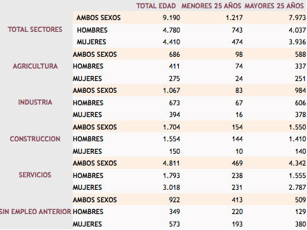 Por otro lado, el colectivo sin empleo anterior según tramos de edad y sexos obtuvo un total de 922 personas; de las que 349 son hombres y 573 son mujeres. Los menores de 20 años son 261 personas, 170 hombres y 91 mujeres; entre 20 y 24 años las cifras son de 152 personas en total, 50 hombres y 102 mujeres; entre 25-29 años, 78 personas, de los que son 20 hombres y 58 mujeres; entre 30 y 34 años, 241 personas: 55 hombres y 186 mujeres y la lista finaliza con los 190 desempleados mayores de 44 años, de los cuales 54 son hombres y 136 mujeres.