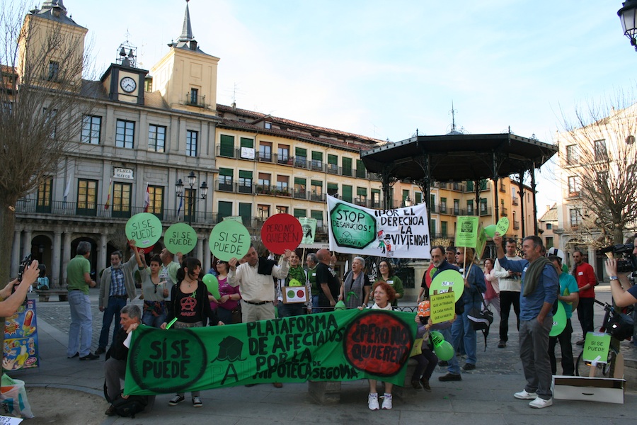 Medio centenar de personas se concentraron hoy ante la sede del Partido Popular de Segovia ubicada en la Plaza Mayor para pedir la “inmediata” paralización de los desahucios así como la dación en pago y el alquiler social de viviendas como solución a este problema. Convocado por la Plataforma de Afectados por la Hipoteca (PAH) de Segovia, el ‘escrache’ exigió al PP la puesta en marcha de medidas efectivas ante una legislación “abusiva” contra los hipotecados.