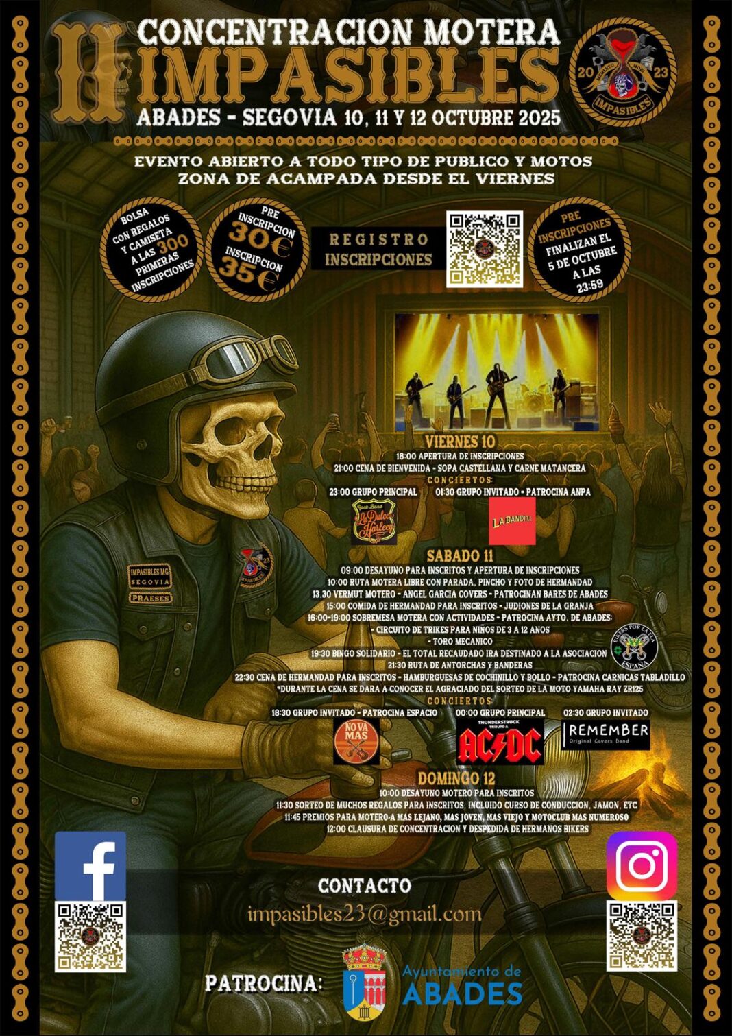 El rugir de cientos de motos se convertirán en la banda sonora del próximo fin de semana en un pueblo de Segovia. La Asociación Motorista Impasibles ha vuelto a convocar en Abades una concentración motera, del 10 al 12 de octubre.
