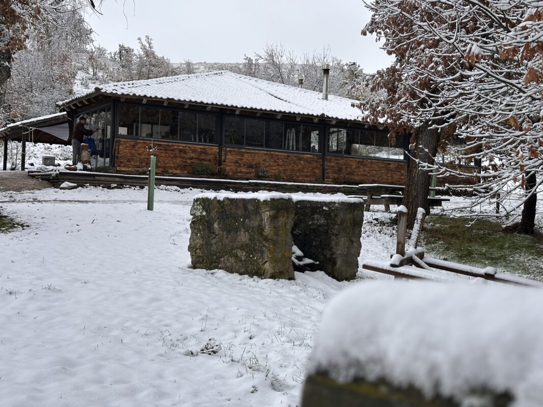 La reforma ha incluido el cerramiento de parte de las instalaciones con grandes ventanales de cristal, una intervención diseñada para mantener la conexión visual con la naturaleza y disfrutar de los cambios de luz y color del robledal a lo largo del año, sin renunciar al confort. El espacio se completa con una chimenea de leña que refuerza el carácter acogedor del restaurante en los meses fríos.