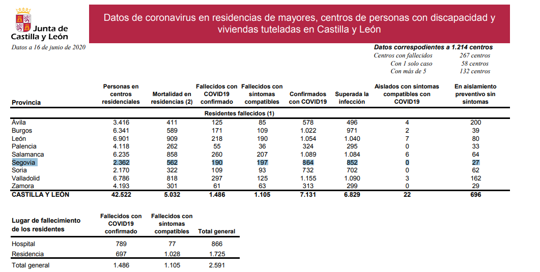 La Junta ha reconocido que el número de fallecidos no es posible darlo con exactitud ya que algunos residentes (sin especificar por las autoridades) fallecen en el Hospital. La realidad es que el número de residentes que ha fallecido diagnosticados como positivos asciende a 396, con un fallecido en el hospital el martes 16 después de 13 días sin fallecimientos.