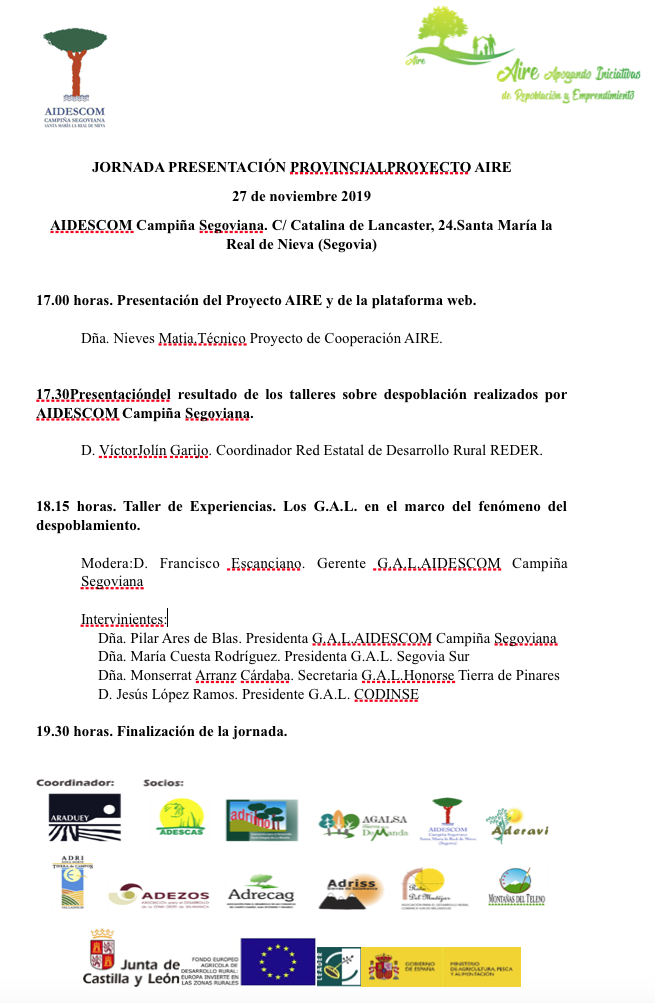 El próximo día 27 de noviembre, a partir de las 17.00 horas, en la sede de AIDESCOM Campiña Segoviana en C/ Catalina de Lancaster, 24, de la localidad de Santa María la Real de Nieva (Segovia), se presentará oficialmente el Proyecto AIRE (Apoyando Iniciativas de Repoblación y Emprendimiento), una iniciativa de carácter práctico que pretende implementar medidas específicas para fijar y atraer personas al medio rural de Castilla y León.
