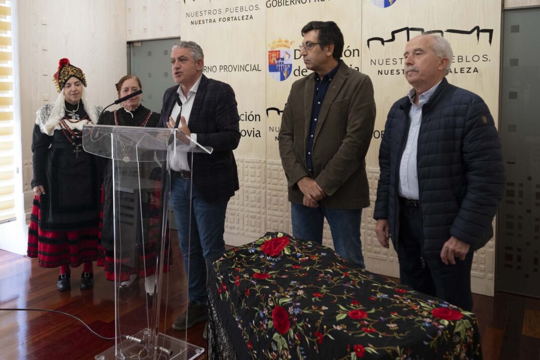 El diputado de Cultura, José María Bravo, acompañado por el teniente alcalde del municipio de Martín Muñoz de las Posadas, Santiago Sáez, y dos representantes de la junta directiva de la Asociación Cultural y Social de Mujeres del barrio de Santo Tomás, Maribel Cristóbal y María Jesús Conde, ha presentado la primera concentración del Traje regional segoviano y la Capa castellana, que tendrá lugar el próximo sábado 19 de octubre en Martín Muñoz de las Posadas.