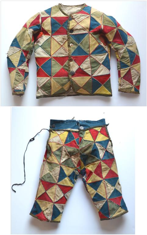 El traje está confeccionado con lanas teñidas en colores rojos, verdes, azules y amarillos, que forman un damero a base de piezas triangulares. La chaqueta de hechura es de corte recto con un largo de 56 centímetros y un contorno de 98 centímetros y presenta mangas de dos hojas de 50 centímetros, cuello a la caja y ribete alrededor, además de cinco botones en el delantero y forro de algodón de color natural. La parte inferior es un calzón ‘de trampa’, que alcanza la altura de las rodillas con un largo de 67 centímetros, con la botonadura propia de este tipo de pantalones, sin bragueta, que se cierra primero desde atrás para abotonar después la pieza delantera. La cintura del calzón mide 80 centímetros y el tiro, 35.