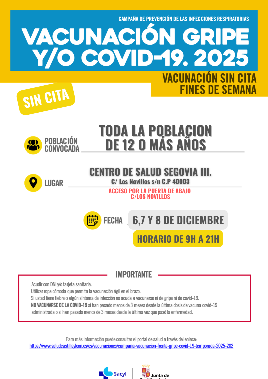 Este fin de semana, continúa la vacunación sin cita previa en Segovia frente a la gripe y la COVID-19. De este modo, los días 6, 7 y 8 de diciembre, desde las 9.00 a las 21.00 horas, los ciudadanos de cualquier punto de la provincia podrán vacunarse frente a estas infecciones respiratorias en el centro de salud ‘Segovia III’ de la capital.
