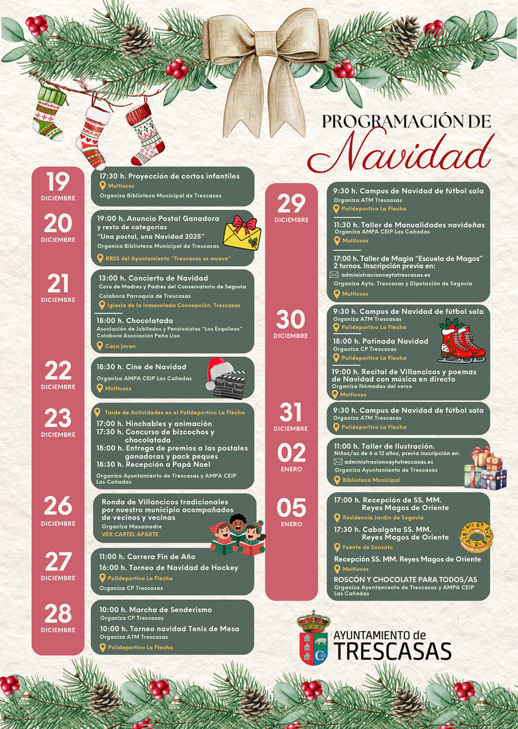 El Ayuntamiento de Trescasas ha preparado un completo programa de actividades para celebrar la Navidad con los vecinos y vecinas del municipio, y todos aquellos visitantes que así lo deseen. La propuesta incluye música, cine, deporte, talleres, actividades infantiles, y las tradiciones más esperadas de estas fechas.