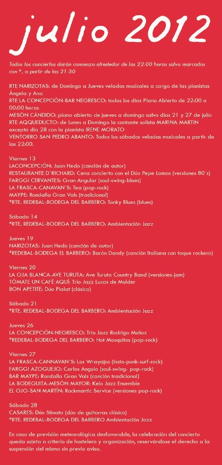 Durante el mes de julio las actuaciones y espectáculos se desarrollarán en las terrazas de los establecimientos hosteleros de la ciudad, y en agosto se trasladarán a distintas localidades de la provincia de Segovia. Asimismo, durante el mes de agosto esta cita cultural, que tiene el objetivo de promover la música de los grupos locales, “aunque también contaremos en la programación con grupos de fuera”, según ha asegurado Fernando Martín, de Artilugio Producciones, así como dinamizar la actividad de los establecimientos hosteleros de la ciudad y sus terrazas, se extenderá hacia la provincia vecina de Ávila.