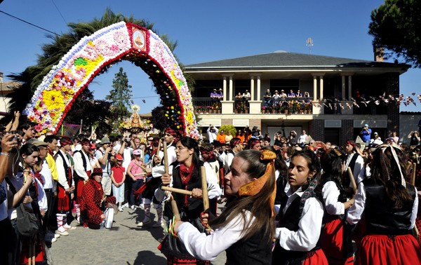El grupo de paloteo, acompañado de dulzaineros, fue por las casas de las siete santeras -a las que acompañan los santeros- para reunirse en la Plaza Mayor, desde donde, en compañía del Ayuntamiento y el resto del pueblo, partieron a la iglesia parroquial, para proceder a la ofrenda de flores. Acabado este acto, tuvo lugar la lectura del pregón, que fue redactado por Raúl Carreras.