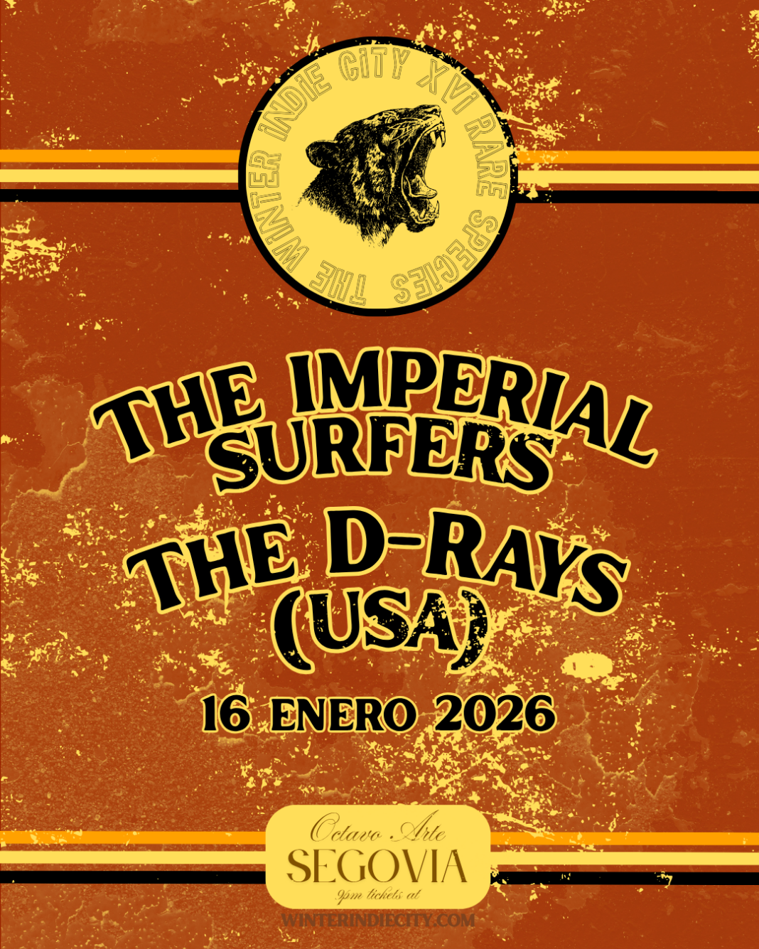 Hoy viernes 16 de enero, a partir de las 21:00 horas, WIC regresa a Octavo Arte acompañado de dos bandas: D-Rays, venidos de ultramar; y una institución dentro del panorama nacional aunque se dejan ver en pocas ocasiones: los Imperial Surfers. Banda de ilustres músicos curtidos en mil batallas que van a dejar el Octavo Arte calentito.